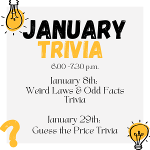 6:00 p.m. Trivia Night – Guess The Price January 7, 2026 by Date: January 29, 2026 Time: 6:00 pm to 7:30 pm
